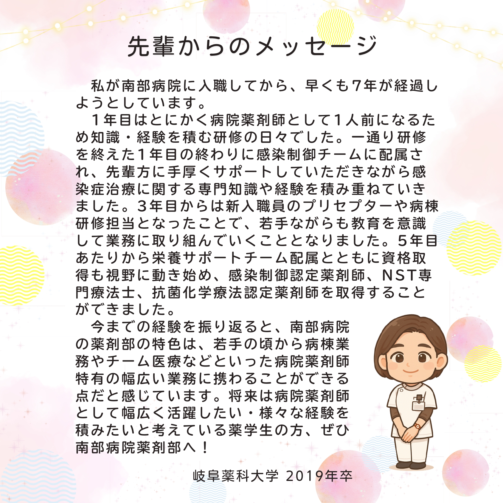 薬剤部は32名の常勤薬剤師に4名の非常勤薬剤師、SPD(Supply Processing and Distribution)派遣スタッフ6名を加え、2022年度より調剤課、薬品情報管理課、病棟薬剤課の3つの課に業務編成しました。病院勤務薬剤師の業務は多岐にわたりますが、基本は適正な薬物療法の推進、チーム医療への貢献であり、我々の部門コンセプトは「互いに学び、高め合う環境の中で未来に向かって限りなく前進する」ことです。薬剤師全員が各課業務と並行して病棟薬剤課併任に関わり、医療現場で多様化する薬に関わる調剤、薬の管理・情報収集伝達などの実践的な業務と共に、患者さんや医療スタッフから信頼される高度な臨床業務の推進に心血を注いでおります。また、薬剤部では、診療・教育・研究を3つの重要な柱としてスタッフ一同日々研鑽に励んでいます。2019年度より「働き方改革・業務改善」、「医療安全」、「教育・研修」、「臨床研究管理」の4つ項目を立て、2023年度より薬剤部独自の教育研修チームを設け、働きやすい職場環境の構築、安全かつ安心して提供できる薬物療法、特定機能病院としての高度な専門教育、臨床研究中核病院として取り組んでいます。また、薬剤部職員が、在職中出身校の代表として先輩からメッセージを挙げさせて頂きました。魅力ある明るく活気のある職場を是非ご覧ください。