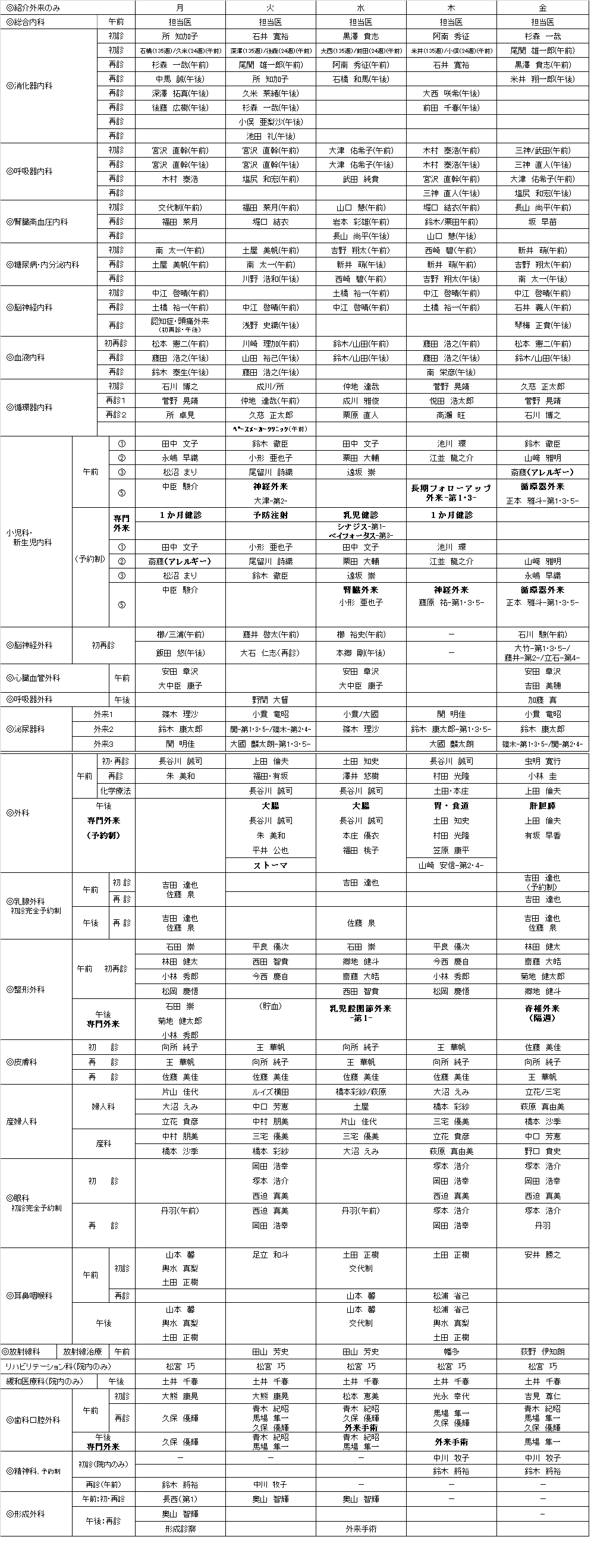 外来医師担当表 2026年2月6日 現在 ※眼科、乳腺外科は完全予約制 休診日:土曜日、日曜日、祝日 【外来医師担当表】PDFダウンロード (PDF ファイル 0.28MB) 紹介予約 地域医療連携室 電話:045-832-8337 受付時間:9時00分~17時00分(月~金曜日) 予約は医療機関、患者さん本人もしくはご家族からお受けいたします。 詳しくはこちらをご覧ください。 各診療科ページ 総合内科 消化器内科 呼吸器内科 腎臓高血圧内科 糖尿病・内分泌内科 神経内科 血液内科 リウマチ・膠原病内科 循環器内科 小児科・新生児内科 脳神経外科 心臓血管外科 呼吸器外科 外科 乳腺外科 整形外科 皮膚科 泌尿器科 産婦人科 眼科 耳鼻咽喉科 放射線科 リハビリテーション科 緩和医療科 歯科口腔外科 形成外科 精神科